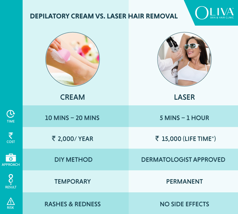 Knowing about their disadvantages, it must be clear that hair removal creams are not a permanent solution to get rid of your hair; it is just a quick fix. This section of the article is dedicated to a comparison between two hair removal techniques: Laser Hair Removal and Hair Removal Creams.